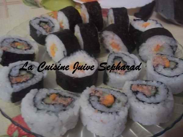 Au moment de servir, couper les sushis avec un couteau bien tranchant et trempe dans l`eau, et disposer a votre guise dans un plat avec au centre du gingembre saumure et une petite boule de wasabi, et de la sauce soja normale ou sucree ICI.